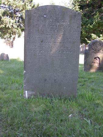 Treatment Report:Integrity of the stone was high, as most of the original carved surface was in tact, but unstable. Most of the carved surface of the marker was blindly delaminating (or delaminating?) at the bedding planes in the stone. 21 holes were drilled into the stone surface, and two of these holes were carved in the decorative death head at top. All detached areas were cleaned with a metal microspatula and compressed air to remove debris. The areas were then flushed with water using a 30 mL plastic syringe, and cotton was packed into areas of delamination. The stone was filled through the drilled holes and areas of detachment on the right side and across the lower area of the stone. The stone was filled with 470 cc of grout injected with a 10 gauge steel cannula attached to a 30mL plastic syringe (in smaller areas a 12 gauge steel cannula was substituted for the 10 gauge). The grout was given 48 hours to settle and solidify. The marker was then cleaned with water and a 50% ammonia (industrial strength is 10% ammonia) solution in water. Wooden tools and a suede copper brush were used to remove biogrowth. The stone was then patched with a mortar fill earlier specified. A tree was removed from behind the stone. After the mortar dried for a period of one week, the stone was brushed with a 10% acetic acid in water for a dwell time of three minutes. The stone was rinsed thoroughly with water as a final treatment step.